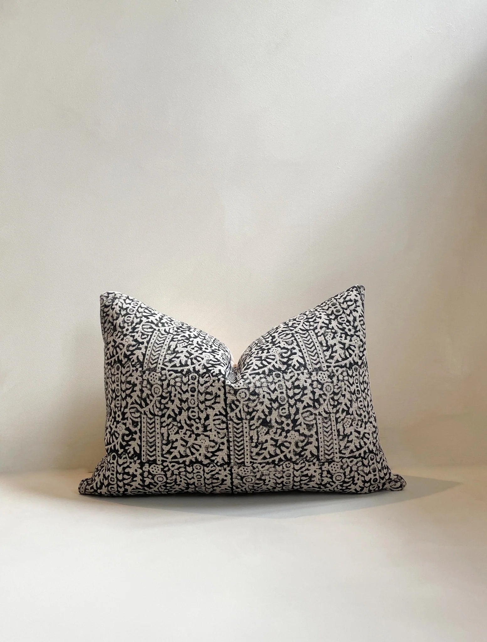 Our Zia cushion cover features a unique muted black design pressed against a luxury heavy weight linen