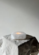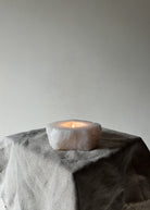 Hand-cut natural quartz tealight holder, left in its raw form rather than polished or machine-finished. Each piece is individually carved from solid quartz, giving a softly diffused glow when a candle is lit. The stone’s natural translucency creates a warm, even light, making it ideal for atmospheric styling.