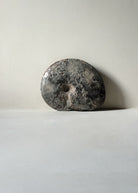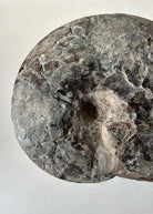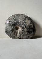 The fossil remains in its raw, unpolished state, with visible sutures, compression patterning, and mineralised surface textures ranging from deep charcoal to calcified grey, earthy brown and ochre.
