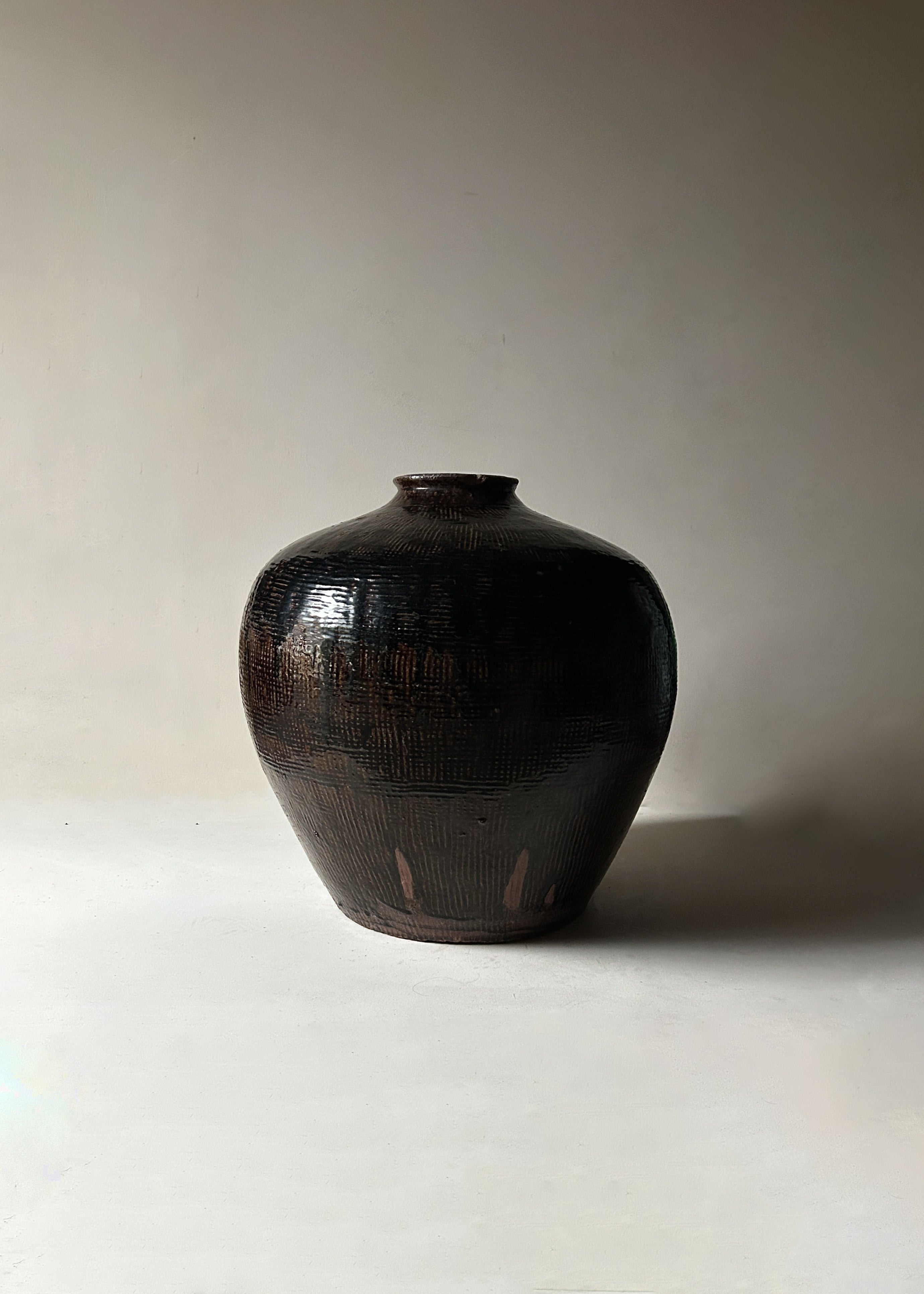 Strikingly beautiful rare antique wine jar from rural Asia, dating to the late Qing to early Republic era (c. 1880–1930). Hand thrown in thick earthenware and finished in a dark iron-rich glaze with a subtle cross-hatched surface texture.