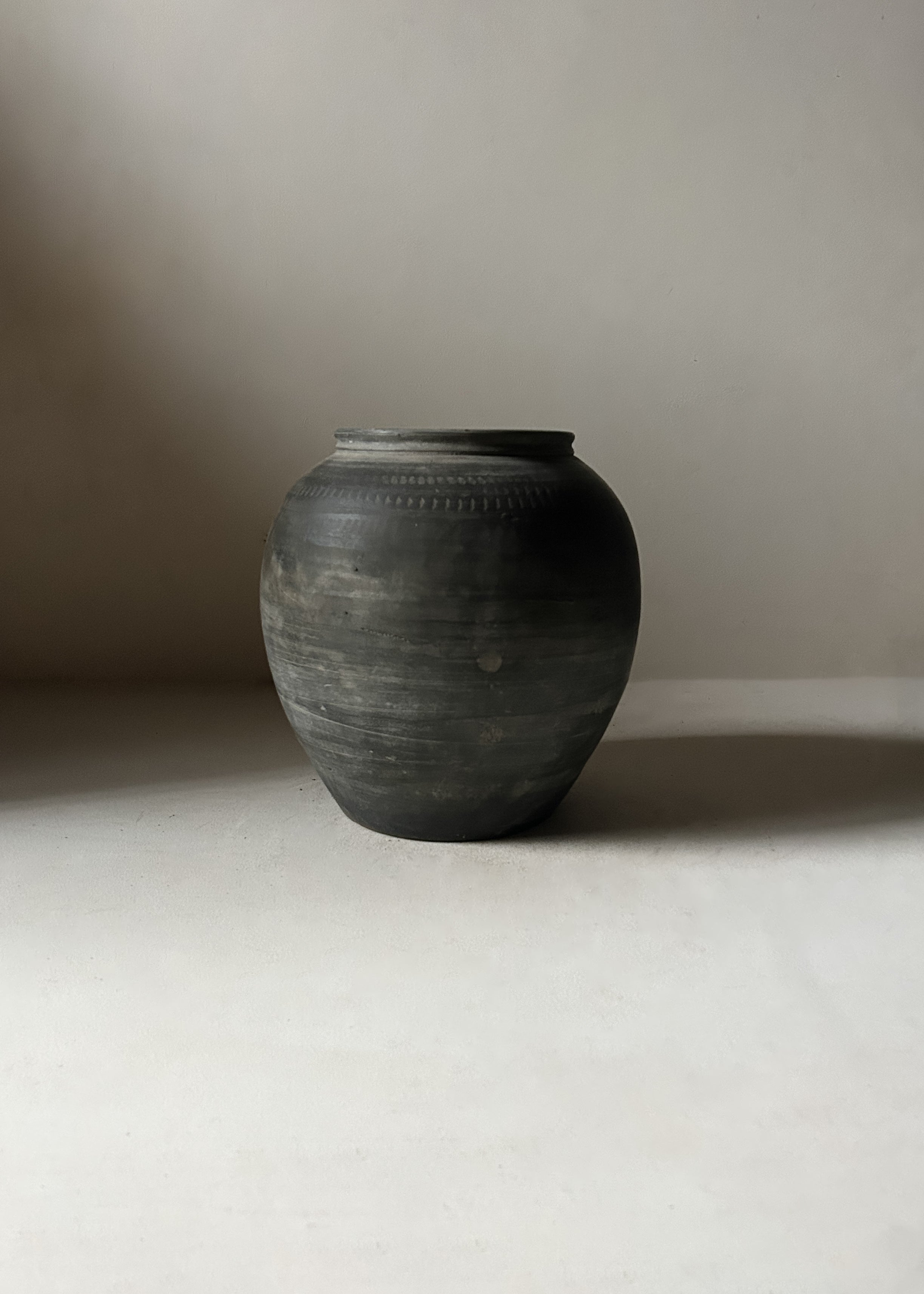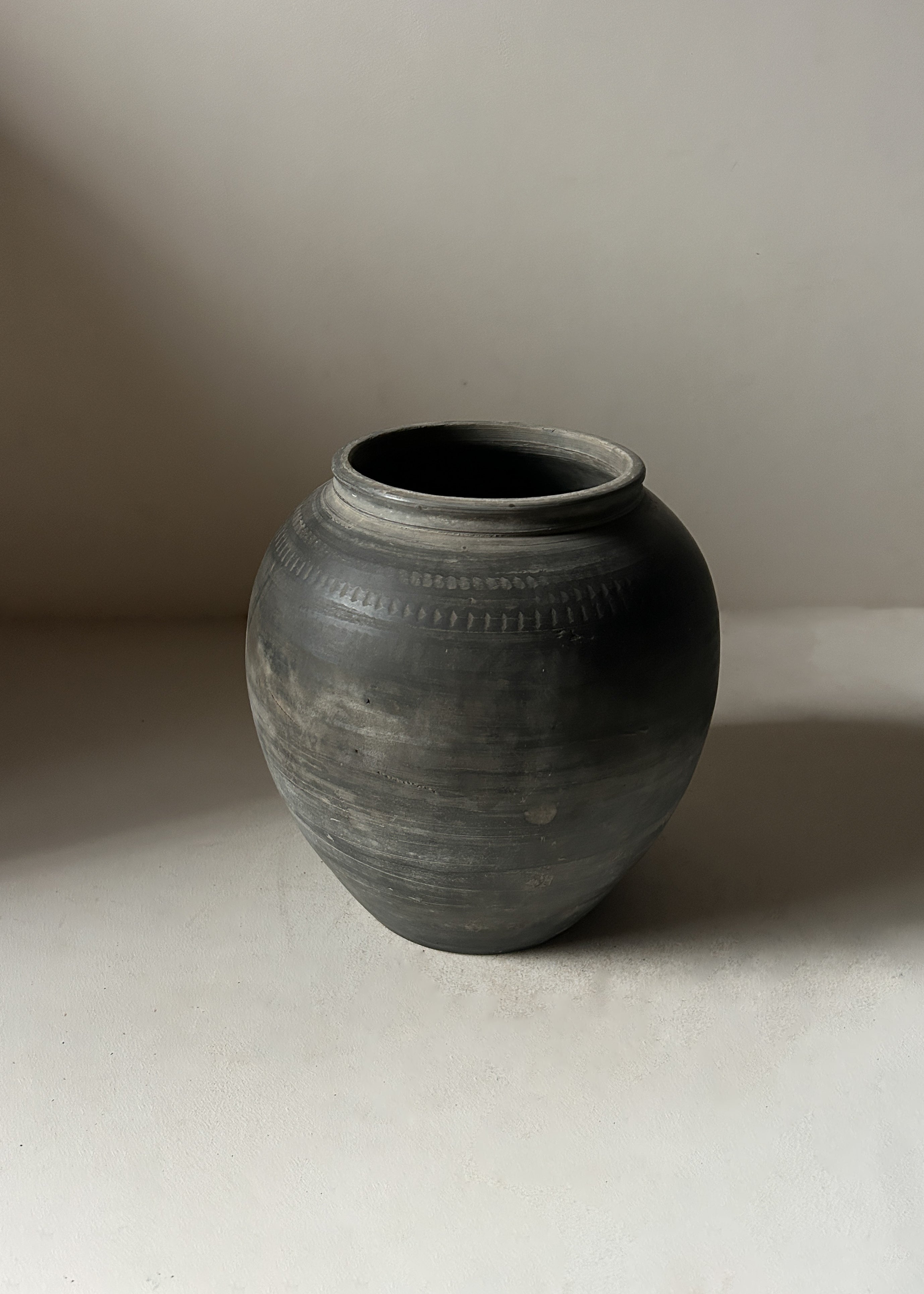 A beautiful vintage clay pot traditionally used for storing and carrying water. Hand thrown from unglazed earthenware, it features subtle surface markings and a decorative hand carved incised pattern around the neck.