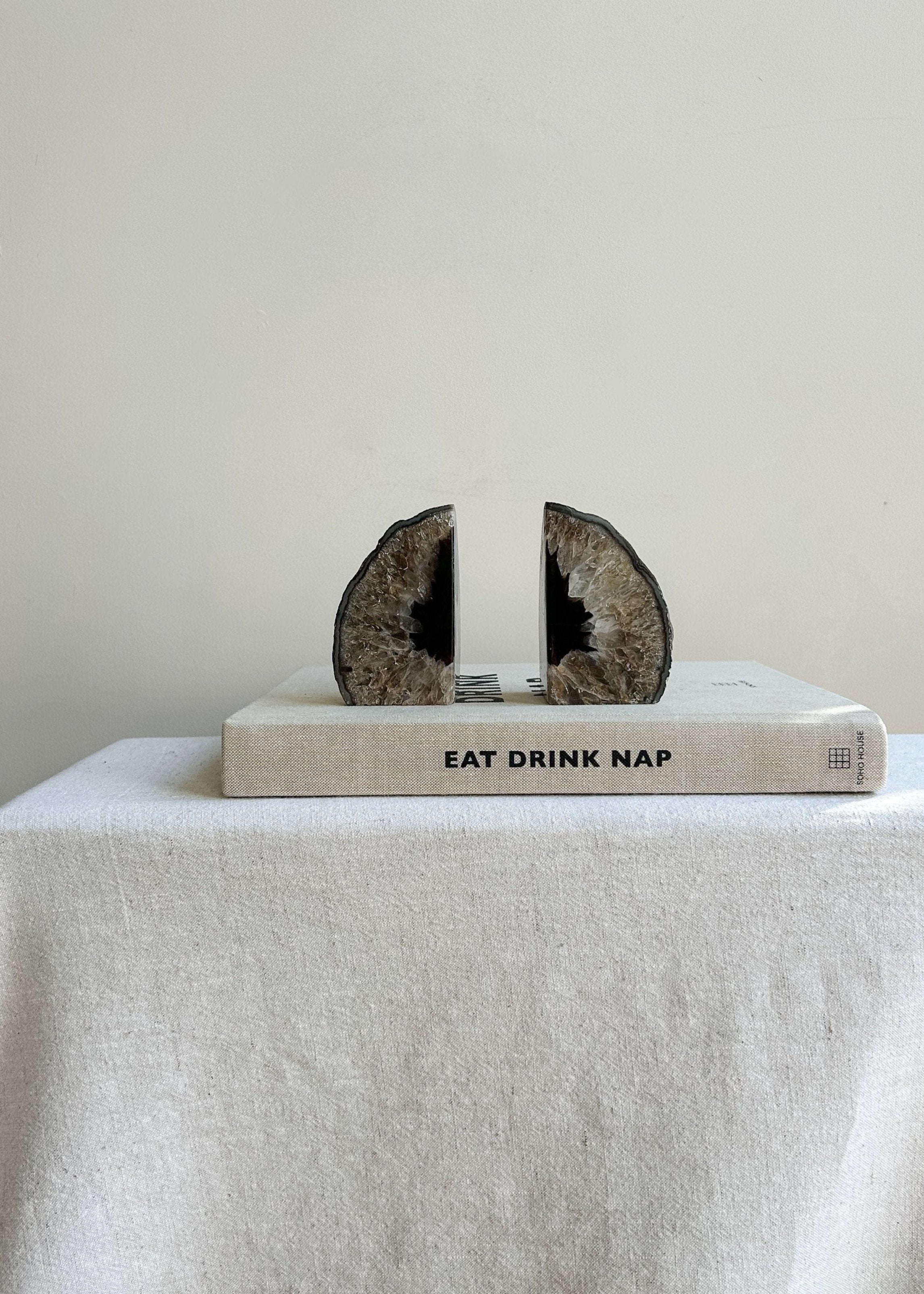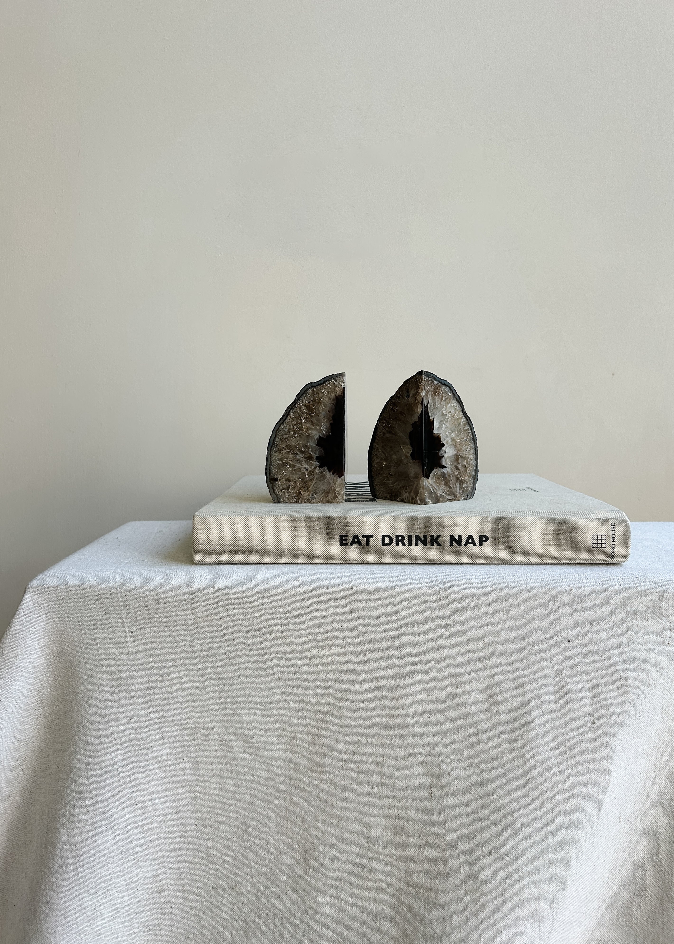 A beautiful pair of natural agate bookends, featuring a high shine finish contrasted against a natural stone exterior