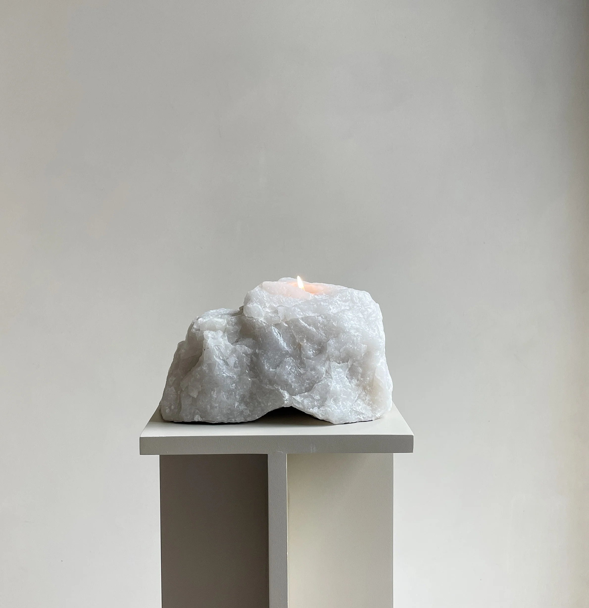 A stunning chunky quartz candle holder, featuring a cut-out to hold a t-light or thick dinner candle